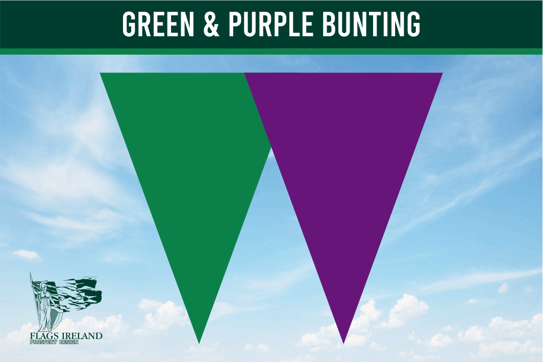 Unsere Standard-Wimpelkette in den Farben Grün (National Green) und Lila ist ideal für den Innen- und Außenbereich. Jede Länge ist 9 m lang mit 18 Wimpeln pro Länge. Jeder dreieckige Wimpel misst 20 x 28 cm und besteht aus unserem gestrickten Polyester-Flaggenmaterial und ist zu dickem Band zusammengenäht. In Irland hergestellt mit weltweiter Lieferung.