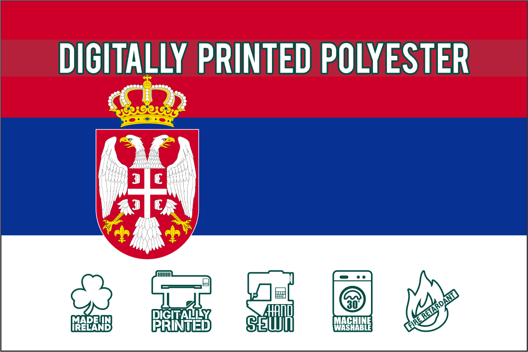 Unsere digital gedruckte serbische Flagge ist in einer Vielzahl von Größen und Ausführungen erhältlich, die alle in der Bildergalerie detailliert beschrieben werden. Seit über 70 Jahren stellen wir auf unserem Gelände im Stadtzentrum von Dublin hochwertige internationale Flaggen her.