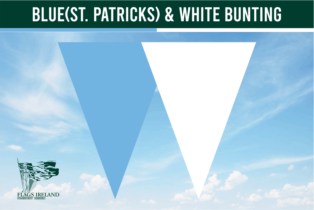 Unsere standardmäßige einfarbige Wimpelkette in Himmelblau und Weiß ist ideal für den Innen- und Außenbereich. Jede Länge ist 9 m lang mit 18 Wimpeln pro Länge. Jeder dreieckige Wimpel misst 20 x 28 cm und besteht aus unserem gestrickten Polyester-Flaggenmaterial und ist zu dickem Band zusammengenäht. In Irland hergestellt mit weltweiter Lieferung.