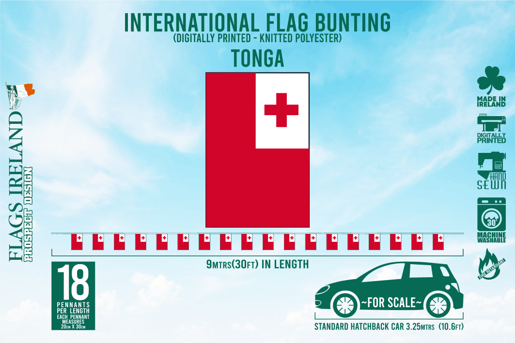 Unsere Wimpelkette mit Tonga-Flagge wird aus unserem gestrickten Polyester-Flaggenmaterial hergestellt und ist daher sowohl für den Innen- als auch für den Außenbereich (lärmfrei) geeignet.