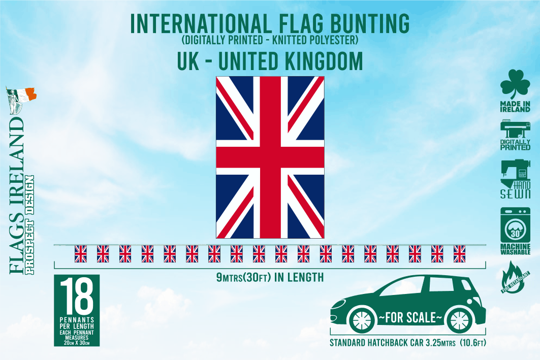 Unsere Wimpelkette mit britischer Flagge wird aus unserem gestrickten Polyester-Flaggenmaterial hergestellt und ist daher sowohl für den Innen- als auch für den Außenbereich (geräuschfrei) geeignet.