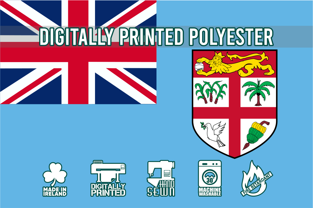 Our Digitally Printed Fijian flag is available in a wide range of sizes and finishes which are all detailed in the image gallery. We have been making quality International flags on our premises in Dublin City Centre for over 70 years.