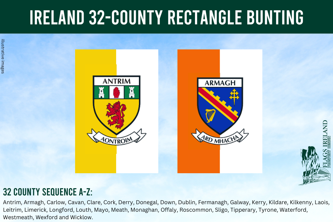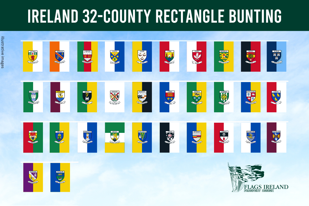 Our Ireland 32 County Rectangle Bunting is made using our knitted polyester flag material so it is fully suitable for both indoor and outdoor(noise free) use. Each Pennant measures 20x28cm.