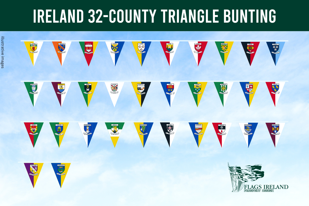 Our Ireland 32 County Triangle Bunting is made using our knitted polyester flag material so it is fully suitable for both indoor and outdoor (noise free) use. Each Pennant measures 20x28cm.