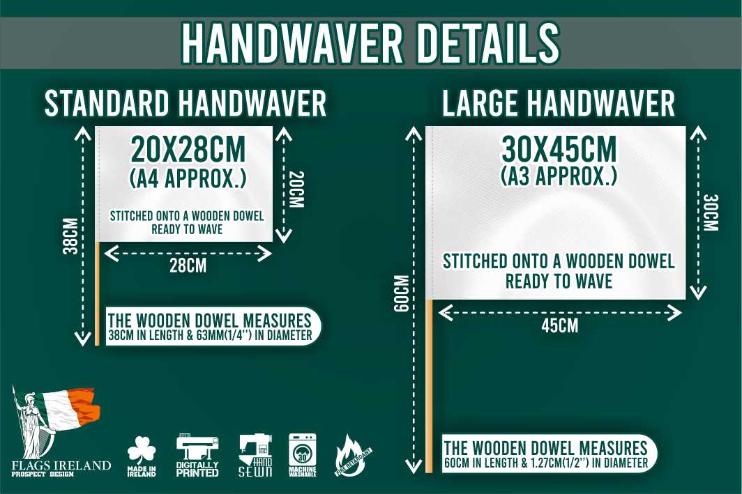 All of our Handwaver flags are digitally printed on high quality knitted polyester flag material and are stitched onto a wooden dowel, ready to wave.