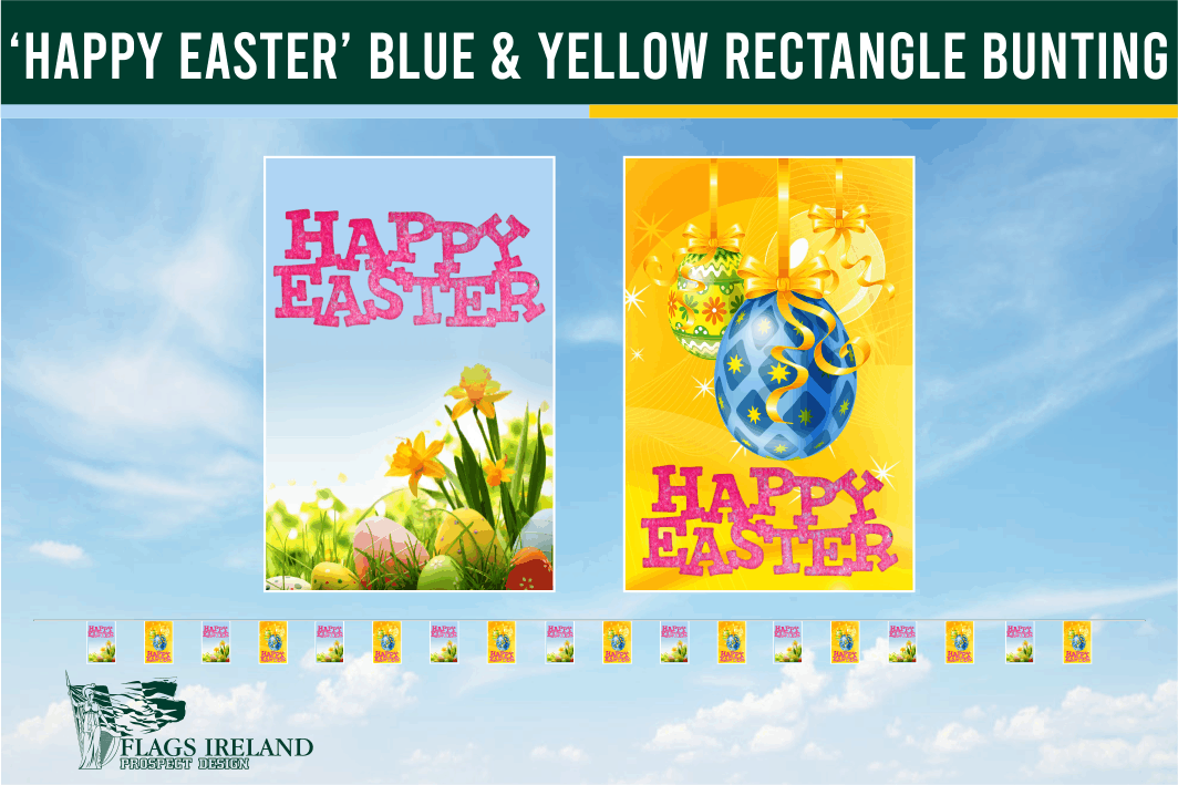 Our ‘Happy Easter’ Blue & Yellow Rectangle Bunting is made using our knitted polyester flag material so it is fully suitable for both indoor and outdoor (noise free) use.