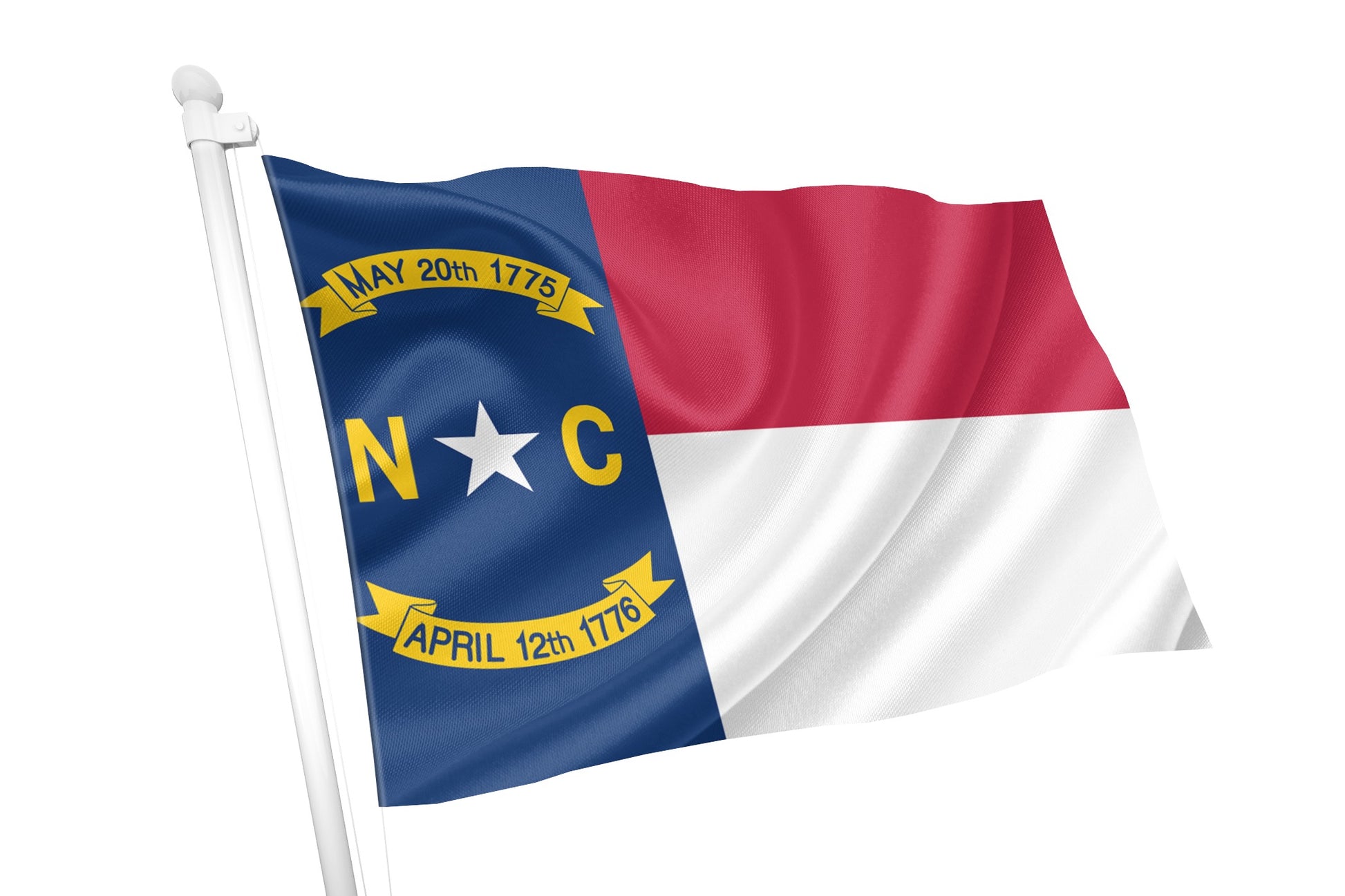 The blue vertical bar on the hoist side contains a large white star, symbolising North Carolina’s place in the Union. Flanking the star are two golden ribbons with important dates in the state’s history:
