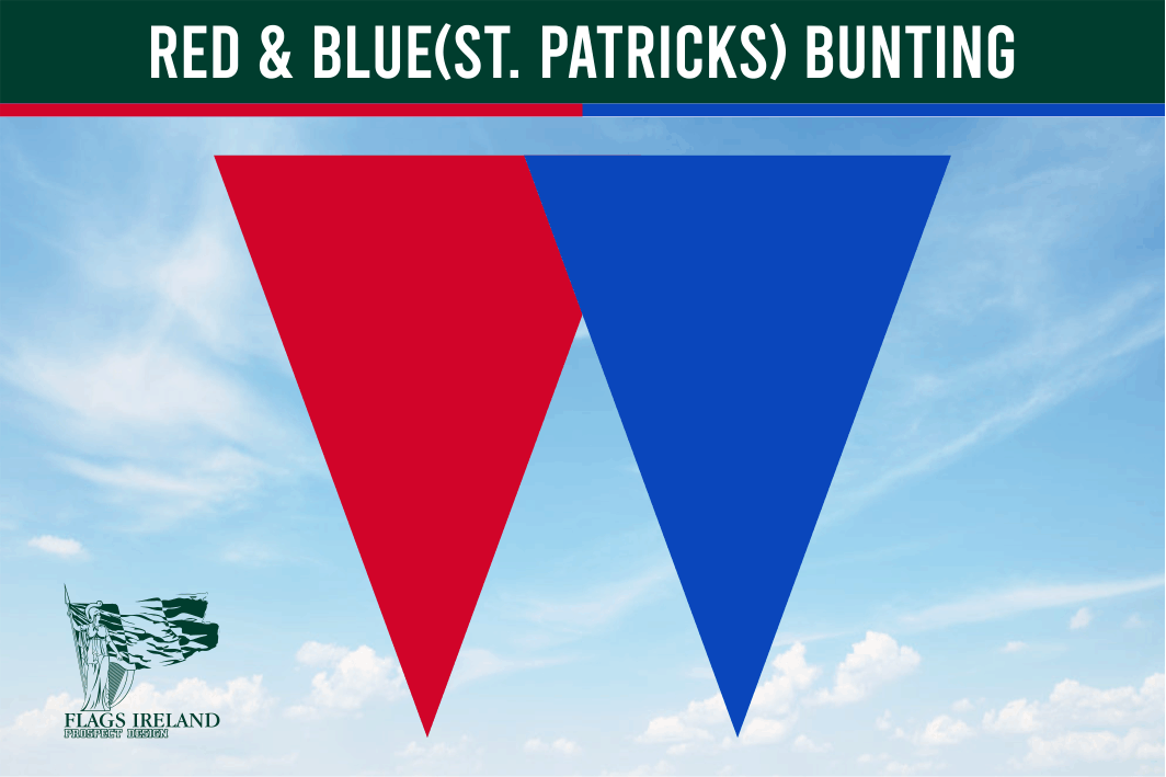 Our Red & Blue(St. Patrick - County) Colour Bunting is ideal for both indoor and outdoor use. Each length comes 9mtrs long with 18 pennants per length. Each triangle pennant measures 20x28cm and is made from our knitted polyester flag material and stitched into heavy tape. Irish made with worldwide delivery.