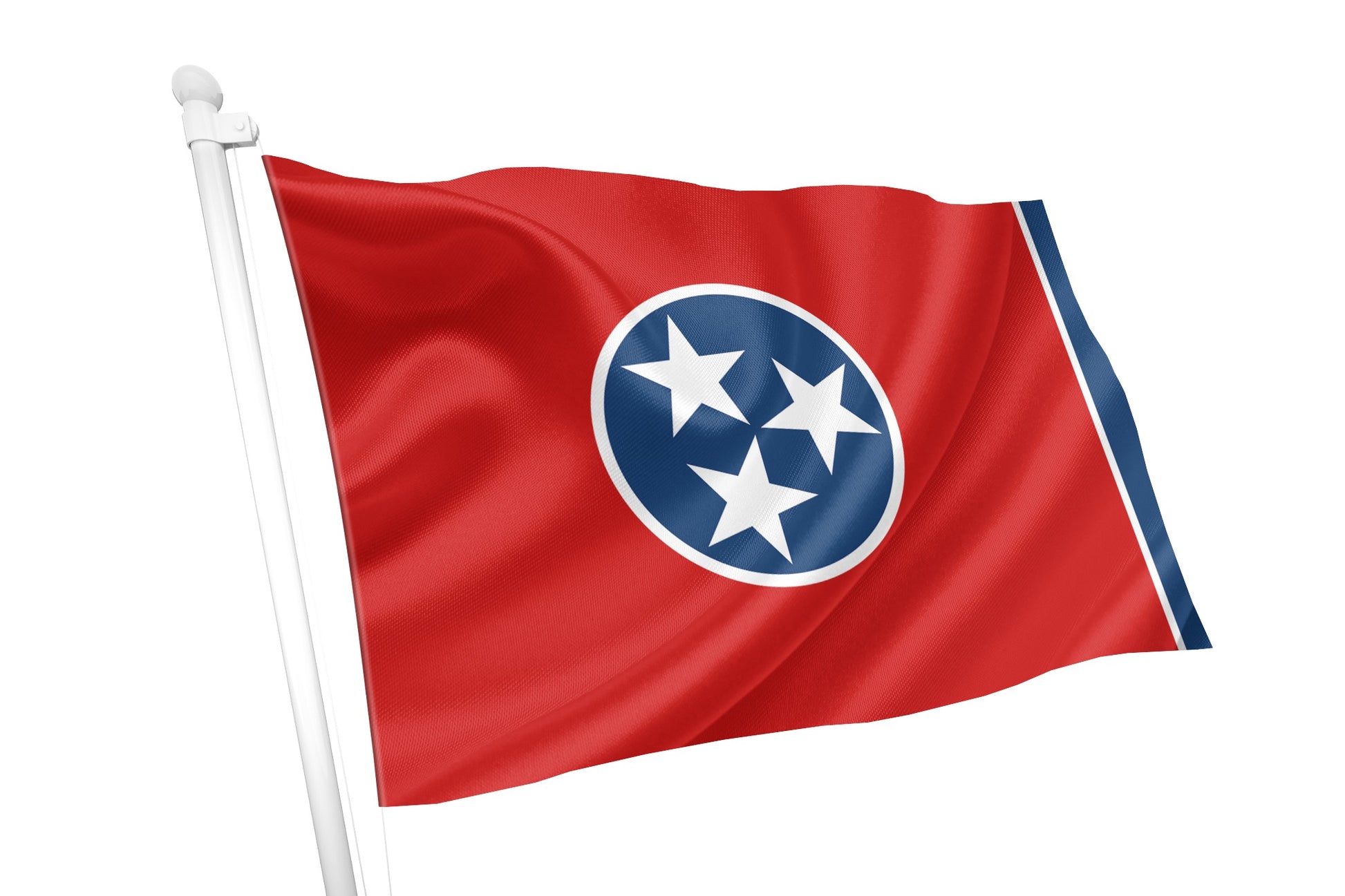 The Tennessee State Flag, officially adopted in 1905, is a bold and striking representation of the Volunteer State’s unity, history, and resilience. Designed by Colonel LeRoy Reeves, the flag’s vivid red field is complemented by a blue vertical stripe on the fly end, bordered with white to create a clean and unique design.