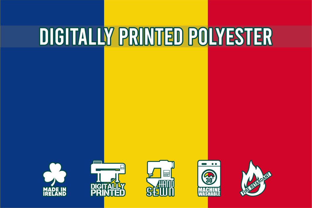 Nossa bandeira do Chade impressa digitalmente está disponível em uma ampla variedade de tamanhos e acabamentos, todos detalhados na galeria de imagens. Há mais de 70 anos que fabricamos bandeiras internacionais de qualidade nas nossas instalações no centro da cidade de Dublin.