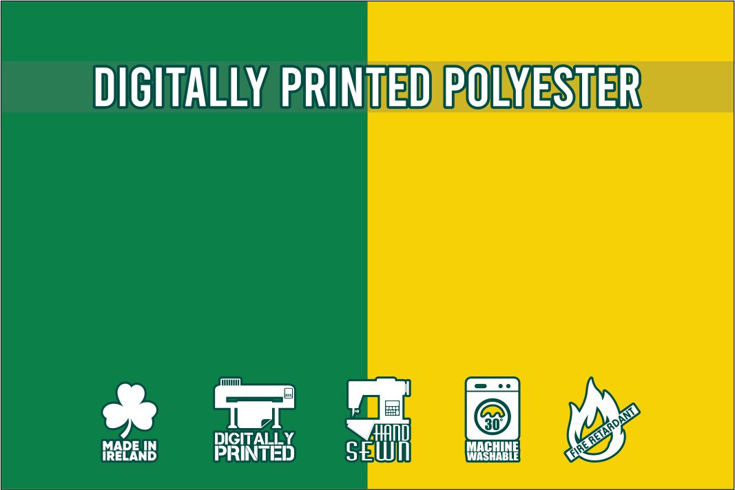 A bandeira combinada de cores Verde e Amarelo Dourado vem em dois materiais diferentes com os detalhes listados abaixo. Ambas as versões desta bandeira são orgulhosamente fabricadas na nossa fábrica em Dublin e estão disponíveis em toda a Irlanda e no resto do mundo.