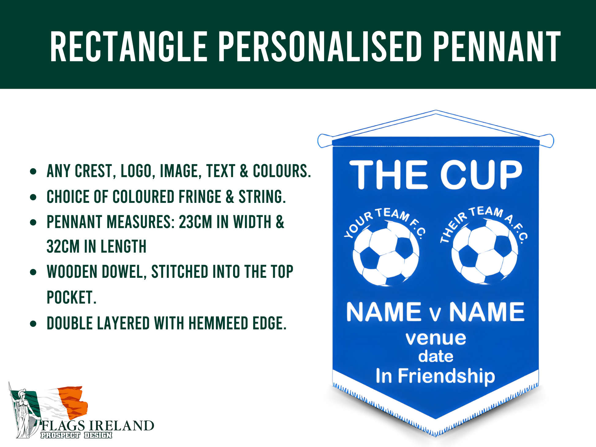 Capture the spirit of your team with a personalised pennant made right here in Dublin, Ireland. Whether it's for a one-off event or a large quantity order, our 23cm x 32cm pennants are the perfect way to showcase your logo, team crest, image, or custom text.