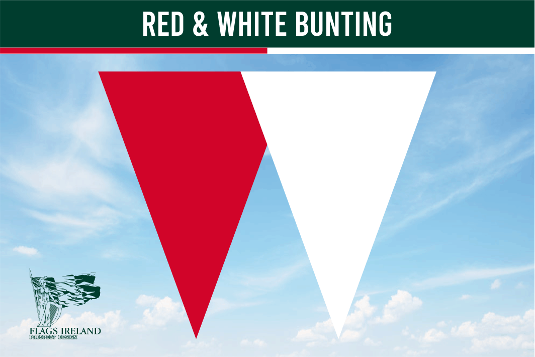 Nosso padrão liso de cor vermelha e branca (cores do condado de Cork, Louth, Derry e Tyrone) é ideal para uso interno e externo. Cada comprimento tem 9 metros de comprimento com 18 flâmulas por comprimento. Cada flâmula triangular mede 20x28cm e é feita de nosso material de bandeira de poliéster tricotado e costurada em fita adesiva grossa. Irlandês feito com entrega em todo o mundo.