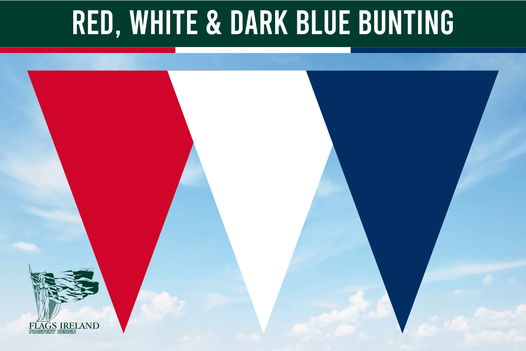 Nossa estamenha colorida vermelha, branca e azul (Dark Royal) (cores do Reino Unido, EUA e França) é ideal para uso interno e externo. Cada comprimento tem 9 metros de comprimento com 18 flâmulas por comprimento. Cada flâmula triangular mede 20x28cm e é feita de nosso material de bandeira de poliéster tricotado e costurada em fita adesiva grossa. Irlandês feito com entrega em todo o mundo.
