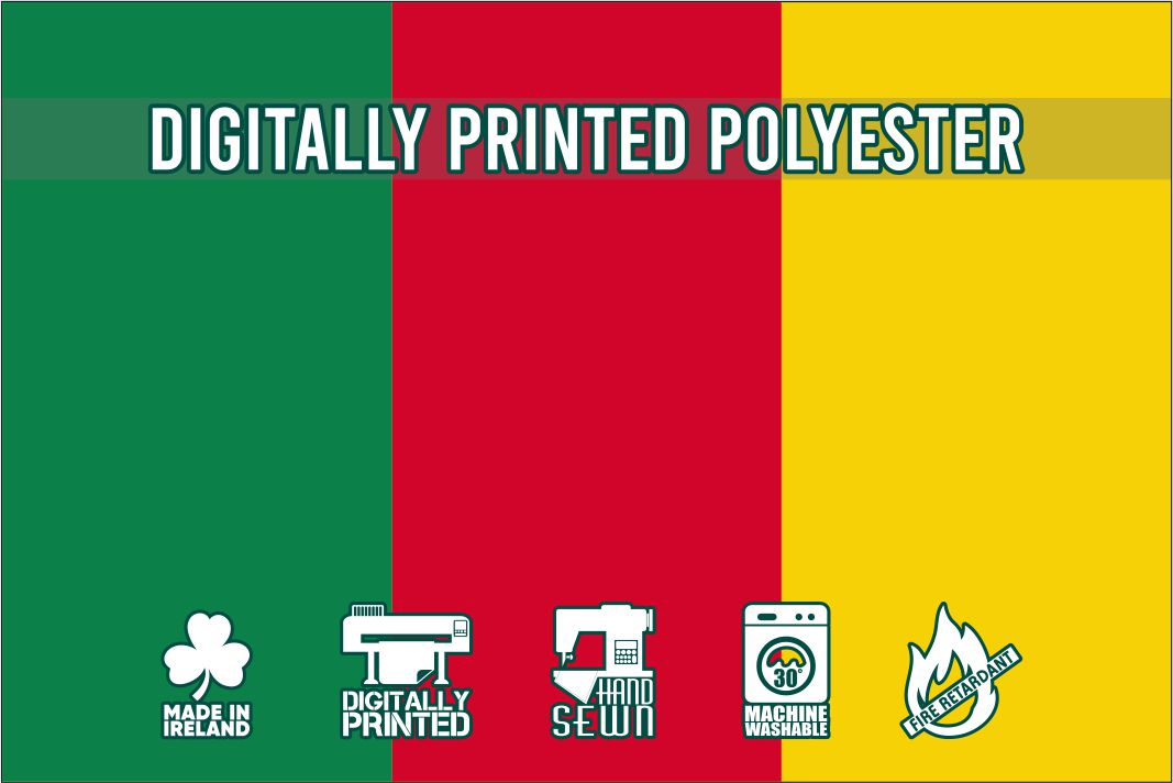 A bandeira combinada de cores Verde, Vermelho e Amarelo Dourado vem em dois tipos diferentes de material que são detalhados abaixo. Ambas as versões desta bandeira são orgulhosamente fabricadas em nossa fábrica em Dublin e estão disponíveis para envio para toda a Irlanda e para o resto do mundo.
